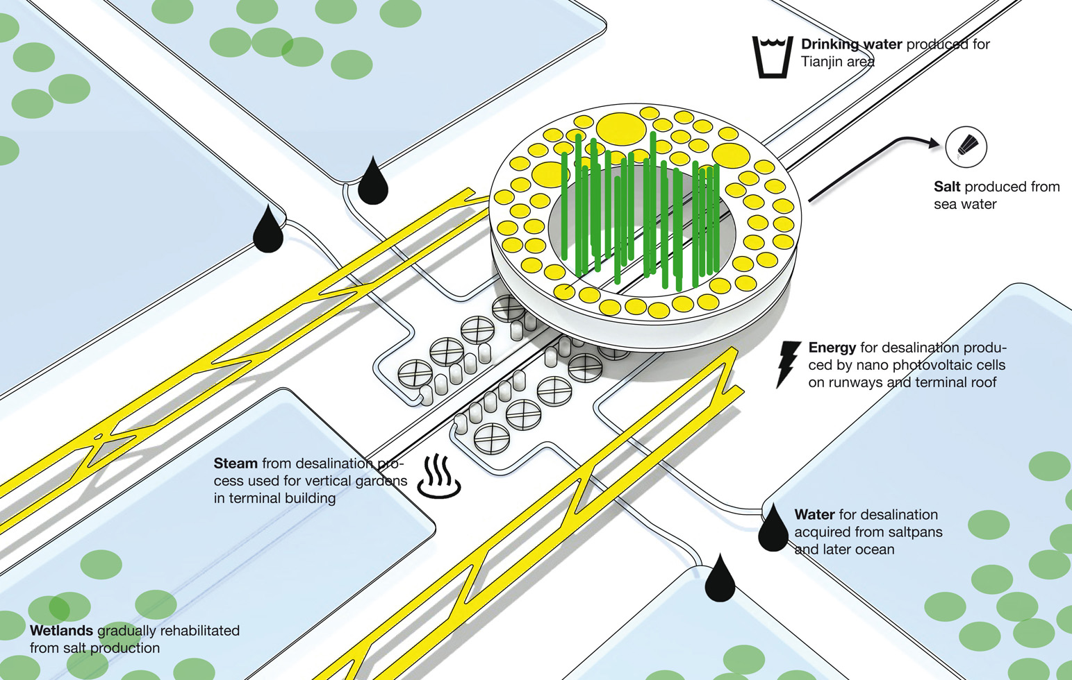 This competition for a new Tianjin Airport takes the idea of an airport to a new level. No longer just a monofunctional piece of transportation infrastructure, but a destination itself, whether you‘re flying or not. Tianjin Airport is a node of social, commercial and environmental facilities, and therefore enriches the simple anchor of arrival and departure towards an urban entity. A new Airport City will develop next to the airport as the Airport increases the attractiveness of the area. It will have a catalyzing effect on the city and eco-city of Tianjin.