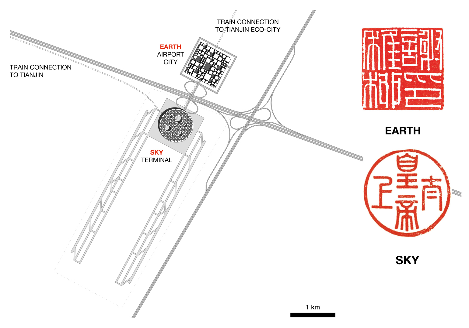 The ancient Chinese perception of the sky to be circle shaped and the earth to be a square inspired us to design Tianjin Airport as a perfect circle. This pure shape shelters the complexity and depth of the sky. The opposite, square-shaped Airport City acts as a counterpart and a symbol for the earth.