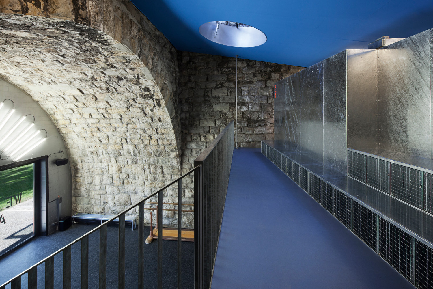 Below the heavy stone arches the training area in the ground floor opens up on one side towards a public park and on the other onto a street and the facing waste treatment plant. The necessary infrastructure – waiting area, lockers and wardrobes – is located on a raised platform, which opens up towards the ground floor and the park. The wardrobes are compactly arranged in order to leave space in front where the lockers offer a place to sit, chill and watch others sweat downstairs.