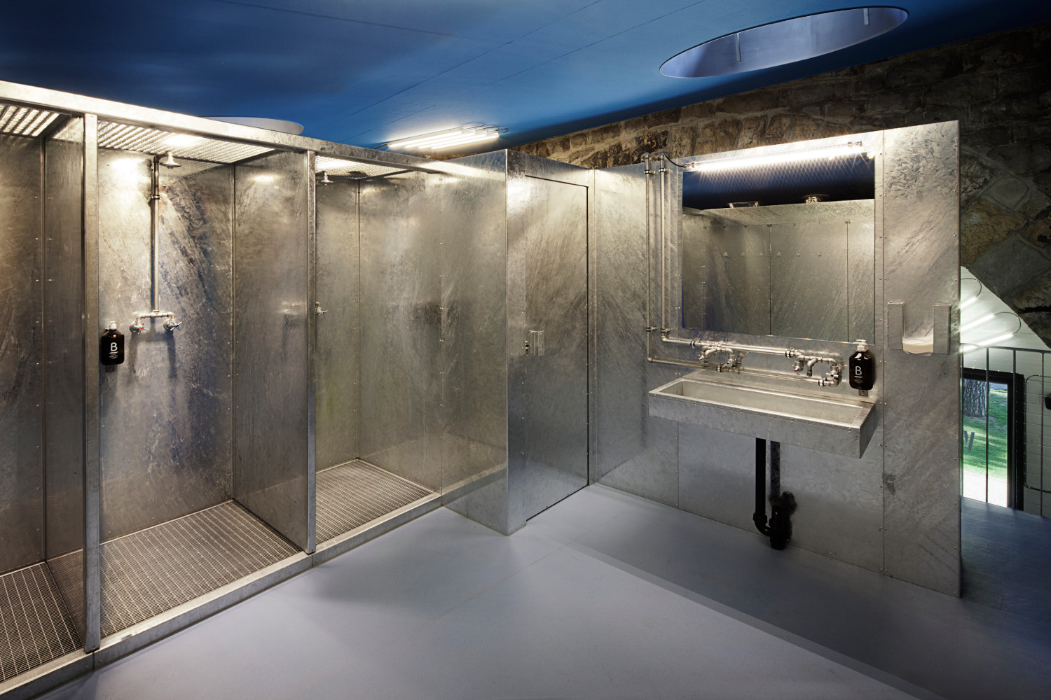 The massive (protected) stone walls and arches of the railway bridge were left untouched. This “rocky” backdrop was contrasted with another hard material: shiny galvanized steel is the dominant material upstairs – the sole material used for all wall panes and fixtures. The shock blue ceiling with graphically arranged lighting fixtures add to the urban atmosphere. A few splashes of signal red in graphics finishes the picture. “Metallism”, the client said.