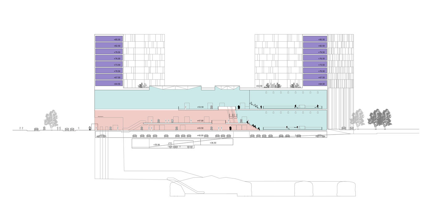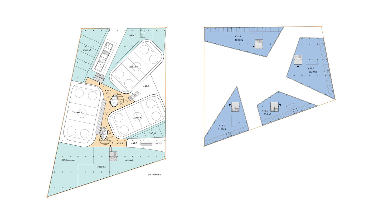 Das Bahnhofsquartier Aviapolis ist ein nachhaltiges Mixed-use-Entwicklungsgebiet oberhalb des Bahnhofs. Als Drehscheibe für die Region wird das Entwicklungsgebiet zum urbanen Herz von Aviapolis und wichtige Referenz für weitere Projekte in der Gegend. Die Mixed-use-Blöcke A und F sind der Ansatzpunkt für die Entwicklung um den Bahnhof. Sie werden als hybrider Gebäudekomplex konzipiert mit Busbahnhof Shopping Center, Eishalle, Büros und Wohnen sowie arrangierten öffentlichen Räumen.