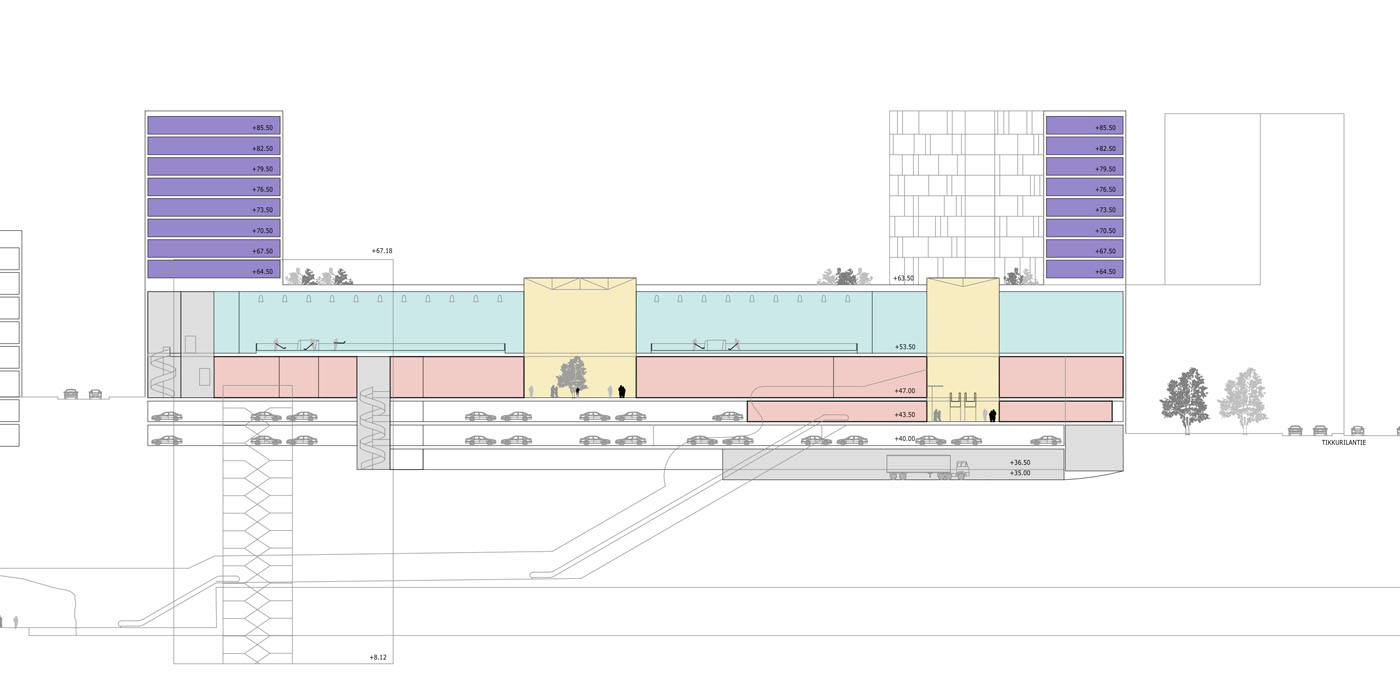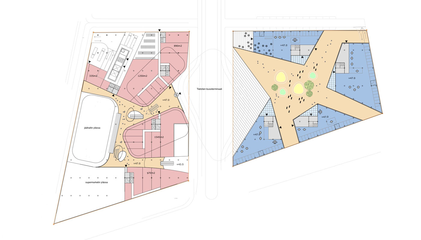 Das Bahnhofsquartier Aviapolis ist ein nachhaltiges Mixed-use-Entwicklungsgebiet oberhalb des Bahnhofs. Als Drehscheibe für die Region wird das Entwicklungsgebiet zum urbanen Herz von Aviapolis und wichtige Referenz für weitere Projekte in der Gegend. Die Mixed-use-Blöcke A und F sind der Ansatzpunkt für die Entwicklung um den Bahnhof. Sie werden als hybrider Gebäudekomplex konzipiert mit Busbahnhof Shopping Center, Eishalle, Büros und Wohnen sowie arrangierten öffentlichen Räumen.