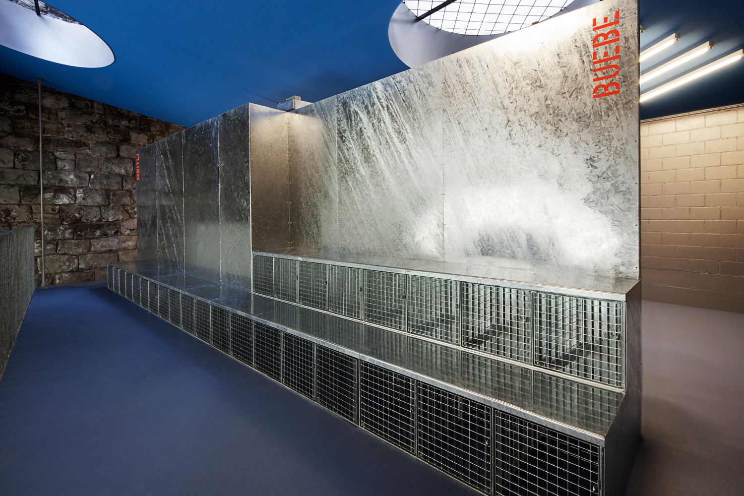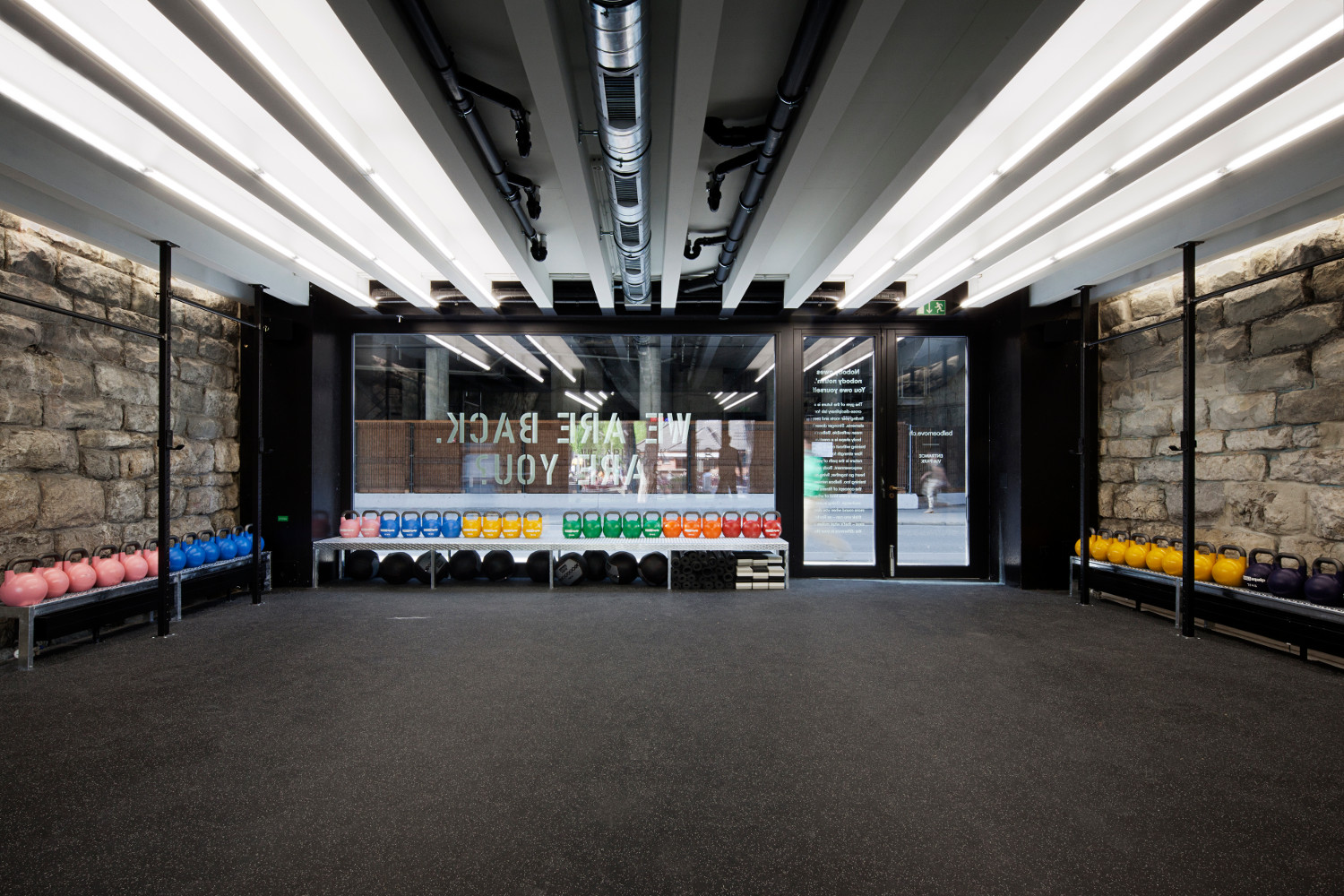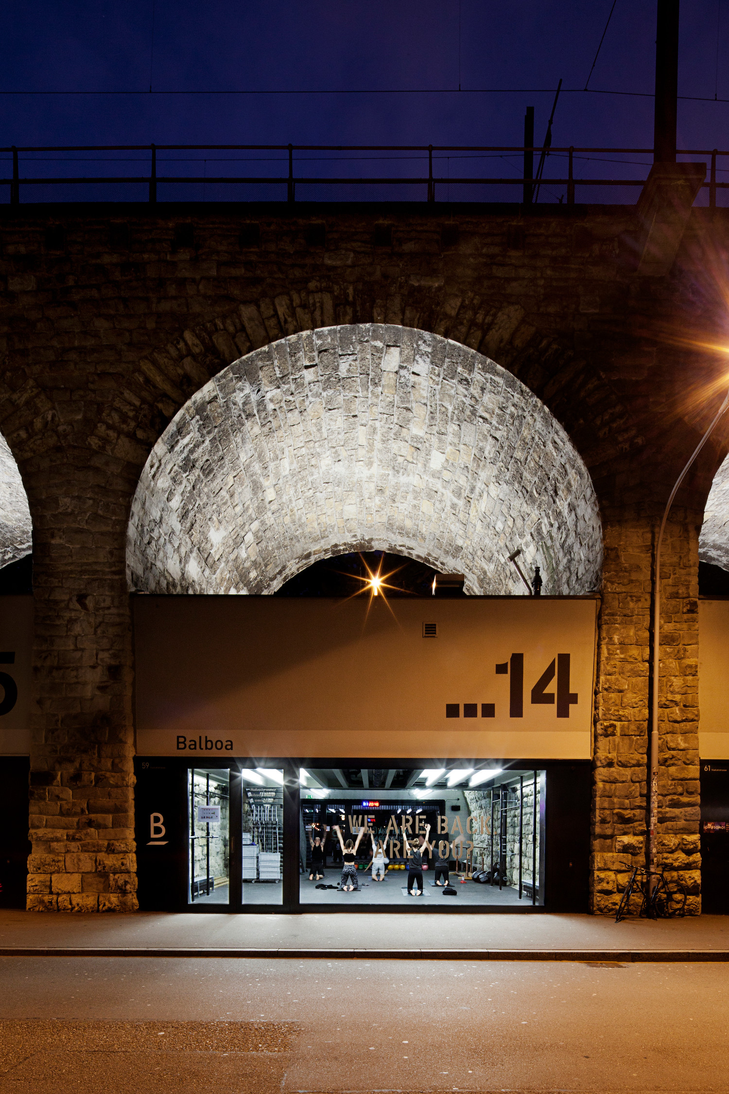 CrossFit heißt der neueste, schweißtreibende Fitnessstudiotrend aus Amerika. Dabei geht es weniger um das herkömmliche, im Wortsinne verstandene Bodybuilding als vielmehr um ein ganzheitliches Training, bei dem sowohl Ausdauer und Kraft als auch Schnelligkeit und Körperbeherrschung geschult werden. Auf komplizierte Trainingsgeräte verzichtet der Sport, stattdessen wird vor allem mit dem Eigengewicht der Kursteilnehmer trainiert. Entsprechend brauchen die Studios erheblich weniger Platz. Das sieht man auch an der neuen Balboa-Filiale in Zürich: Sie kommt mit gerade einmal 160 Quadratmetern auf eineinhalb Geschossen aus. Untergebracht sind die Räume im sogenannten „Viadukt“, einer historischen Eisenbahnbrücke, deren steinerne Bögen 2010 durch das Architekturbüro EM2N geschlossen und für Einzelhandelsflächen nutzbar gemacht wurden. Für die Umgestaltung des Bogens Nummer 14 zum „Balboa im Viadukt“ waren nun wiederum die Architekten Tommi Mäkynen und Mirjam Niemeyer vom Büro Helsinki Zürich verantwortlich, die schon der ersten Balboa-Filiale am Zürcher Schanzen-graben ein Gesicht gaben. Für die Fläche im „Viadukt“ übersetzten Mäkynen und Niemeyer den rauen Charakter des Sportes, der ohne viel Schnickschnack auskommt, in ein authentisches Interieur: Auf der unteren Ebene wird hart trainiert, oben entstanden Duschen, WCs und Umkleiden für „Buebe“ und „Meitli“ aus hartem, galvanisiertem Stahl.