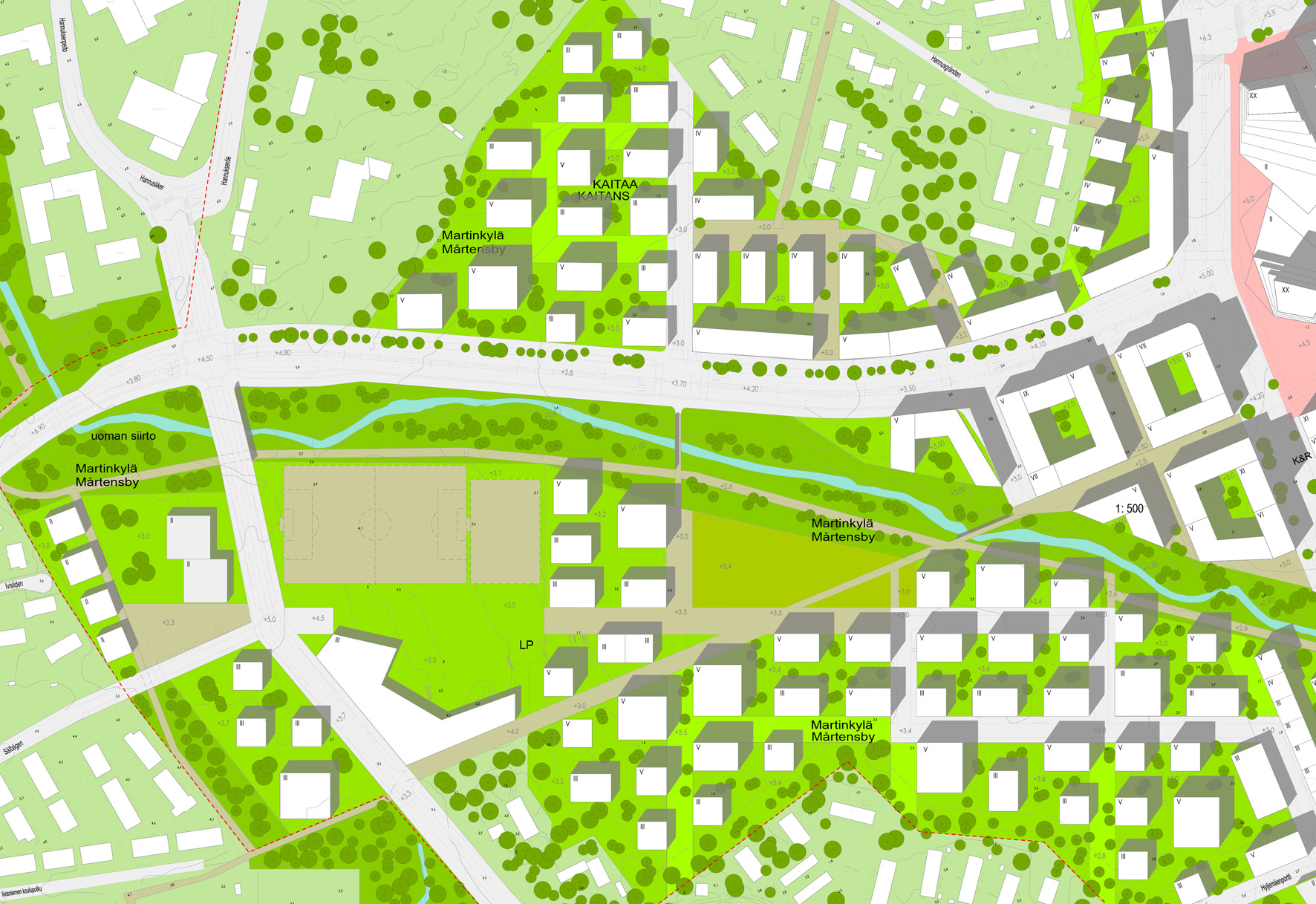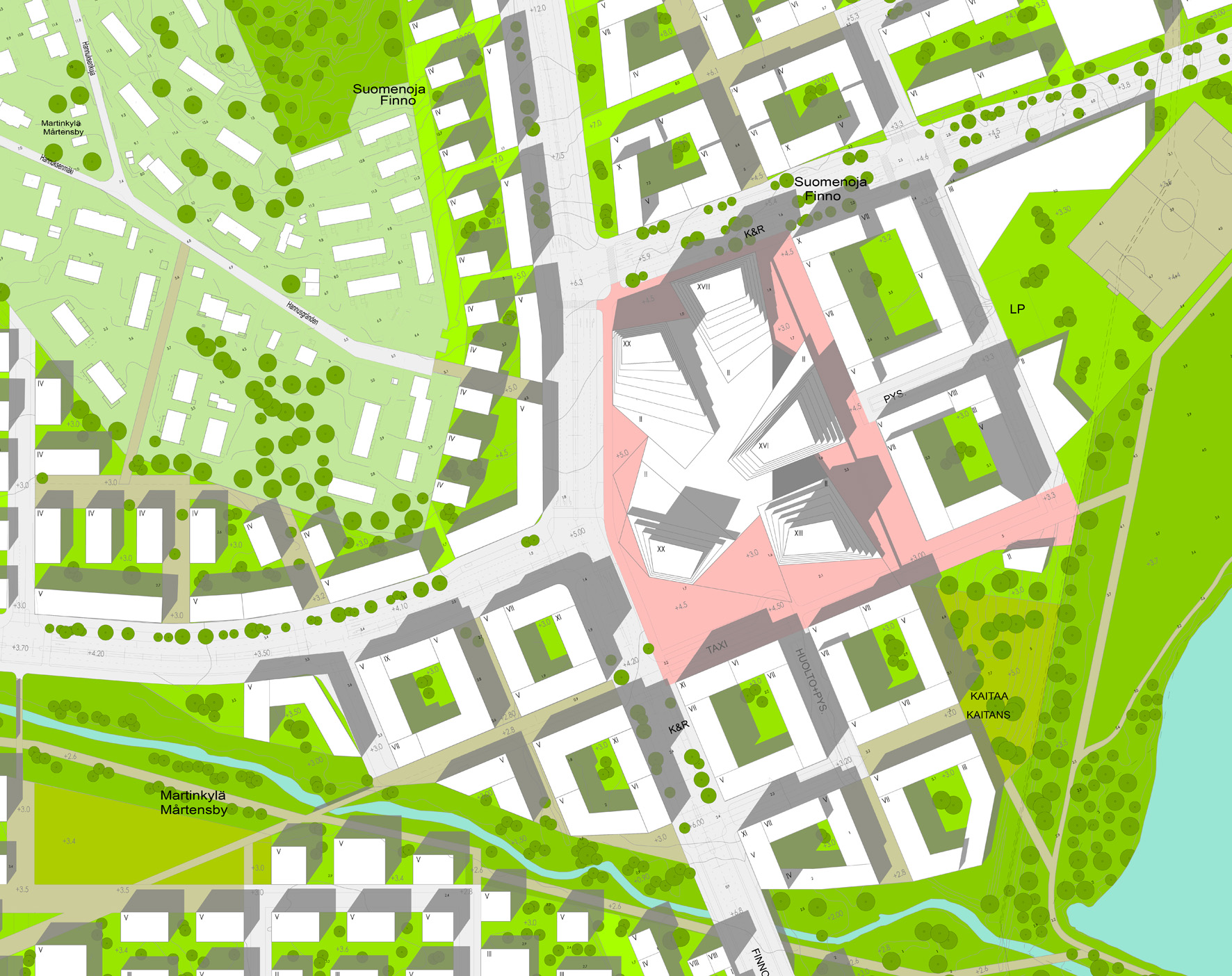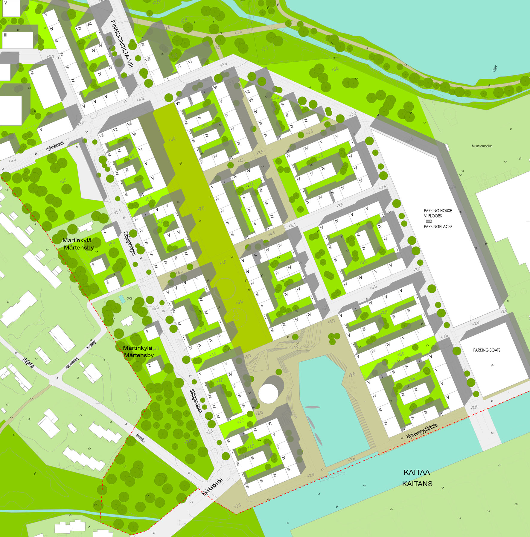 Das neue Öko-Quartier um die geplante U-Bahnstation Finnoo wird zukünftig Platz für 14 000 Einwohner und 6.000 Arbeitsplätze bieten. Finnoo liegt direkt am Meer und grenzt an ein Naturschutzgebiet. Dieser Umstand, ein angrenzendes Kraft-werk und weitere Parameter bilden ein komplexes Gebilde von Randbedingungen für die Entwicklung des Gebietes. Neben hohen ökologischen Zielen wurde eine Reihe von Entwurfsprinzipen als massgebend für die weiteren Planungsschritte definiert: 1) Bezüge zum Meer und zur Natur stellen zentrale Elemente der Identität des Quartiers dar. 2) Die U-Bahnstation ist der funktionelle und strukturelle Ausgangspunkt für die Entwicklung des neuen Stadtteils. 3) Das Gebiet wird mit der Umgebung sehr gut vernetzt. 4) Der Stadtteil setzt sich aus einer Reihe von Quartieren zusammen, die jeweils eine eigene urbane Identität entwickeln. 5) Die Nachbarschaften de-finieren sich durch unterschiedliche Bauty-pologien und Freiraumkonstellationen.