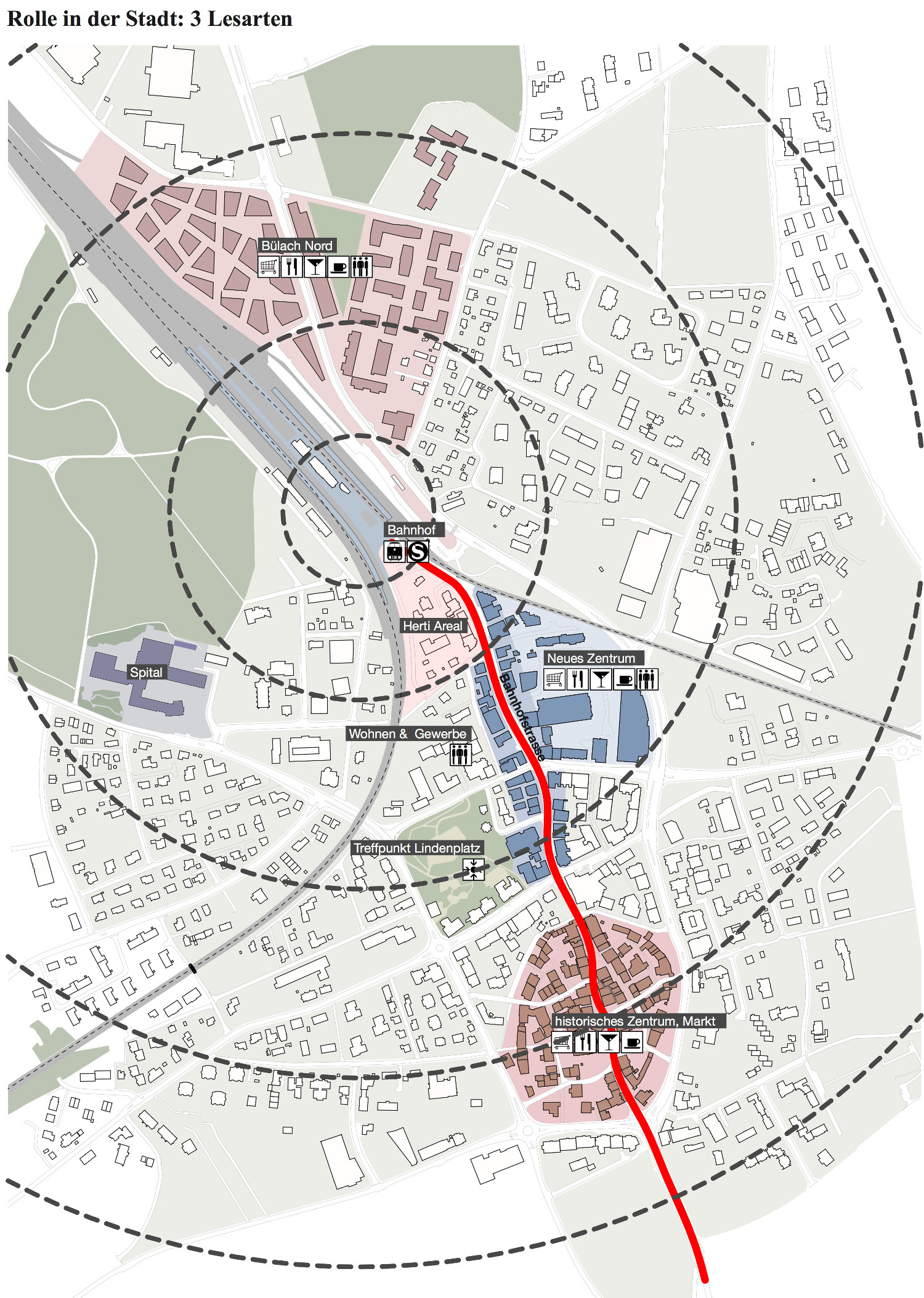 Kommen und Gehen – Der Bahnhof ist geprägt von einem ständigen Kommen und Gehen mit hoher Frequenz. Fussgänger und Pendler finden Aufenthaltsqualitäten und Pendleruntersützende Nutzungen auf dem Bahnhofplatz und entlang des Hertiwegs. Walkability und eine gute Erreichbarkeit mit dem Velo sind sind bestehende