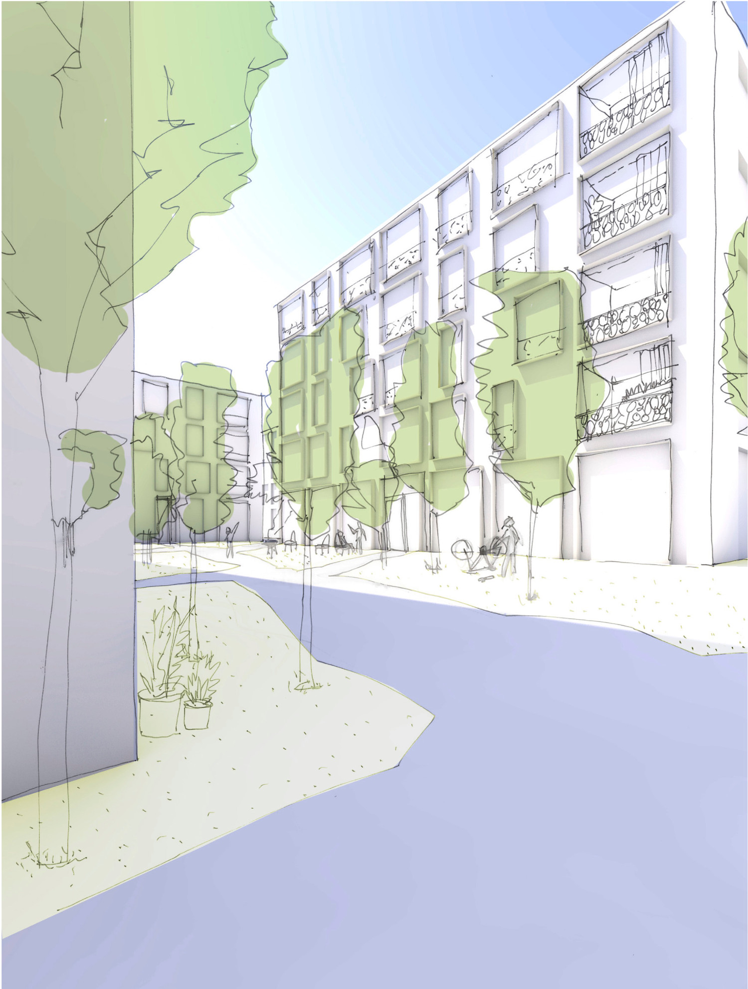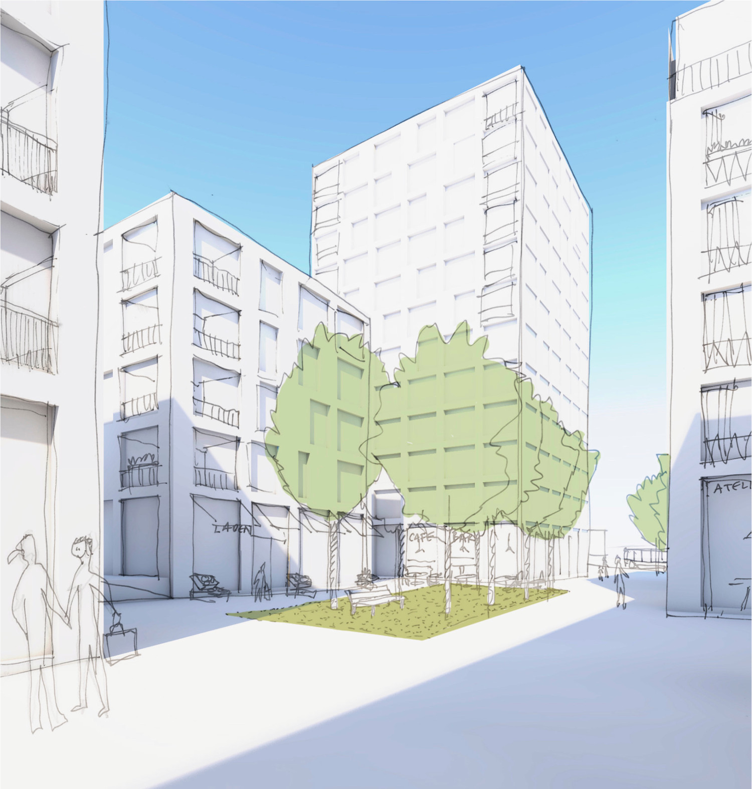 Dicht und Durchmischt – Ein gewisses Mass an Dichte und Nutzungsvielfalt schafft Leben. Oben verdichtetes, urbanes Wohnen unten offene Erdgeschossnutzungen: Entlang des Hertiwegs ein Quartierladen, Cafes und/oder Take Away. An der Bahnhofstrasse Gewerbeflächen. In den Obergeschossen ergänzende Angebote wie Fitness, Co-Working Spaces, zumutbare oder gesponserte «StartUp» Büroflächen, die als flexible, konvertierbare Baustrukturen auch zu Wohnungen umgenutzt werden können. Zentrumsnahes Wohnen- Die Bewohner im Hertiquartier sind Pendler aus der Flughafenregion und Menschen, die gerne zentrumsnah wohnen: Singles, Young Professionals, ältere Paare. Sie wohnen in kleinen und günstigen Wohnungen oder “Plug & play” Servicewohnen.