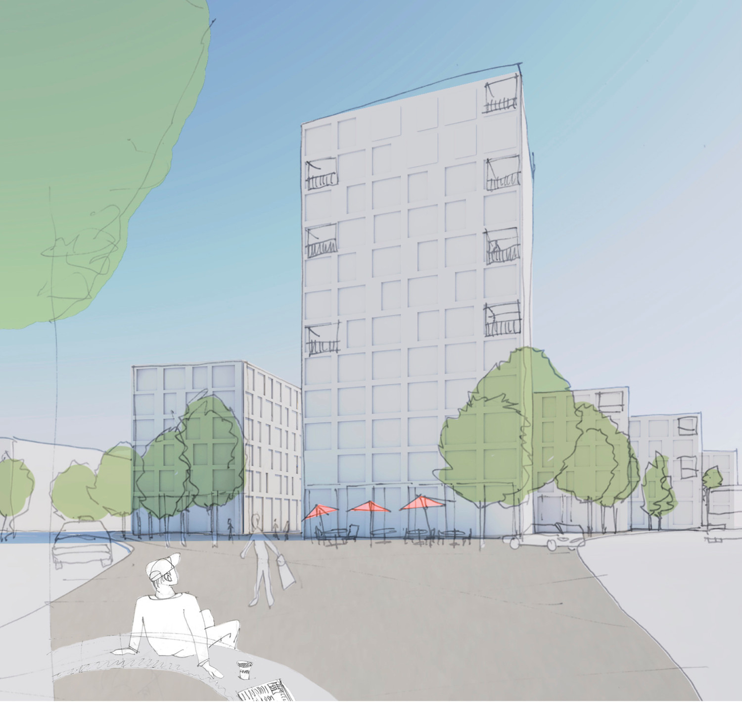 Tor zur Stadt – Der Bahnhofplatz leitet die Fussgänger in Richtung Hertiweg und Bahnhofstrasse. Er wandelt den reinen Transitbereich in einen Ort, der mit aufenthaltsqualitäten für Ankommende, Abreisende oder Umsteigende überlagert wird. Das Hochhaus an der Nordspitze vom Hertiareal markiert diese Schlüsselsituation – den neuen Ort der Stadt am Bahnhof.