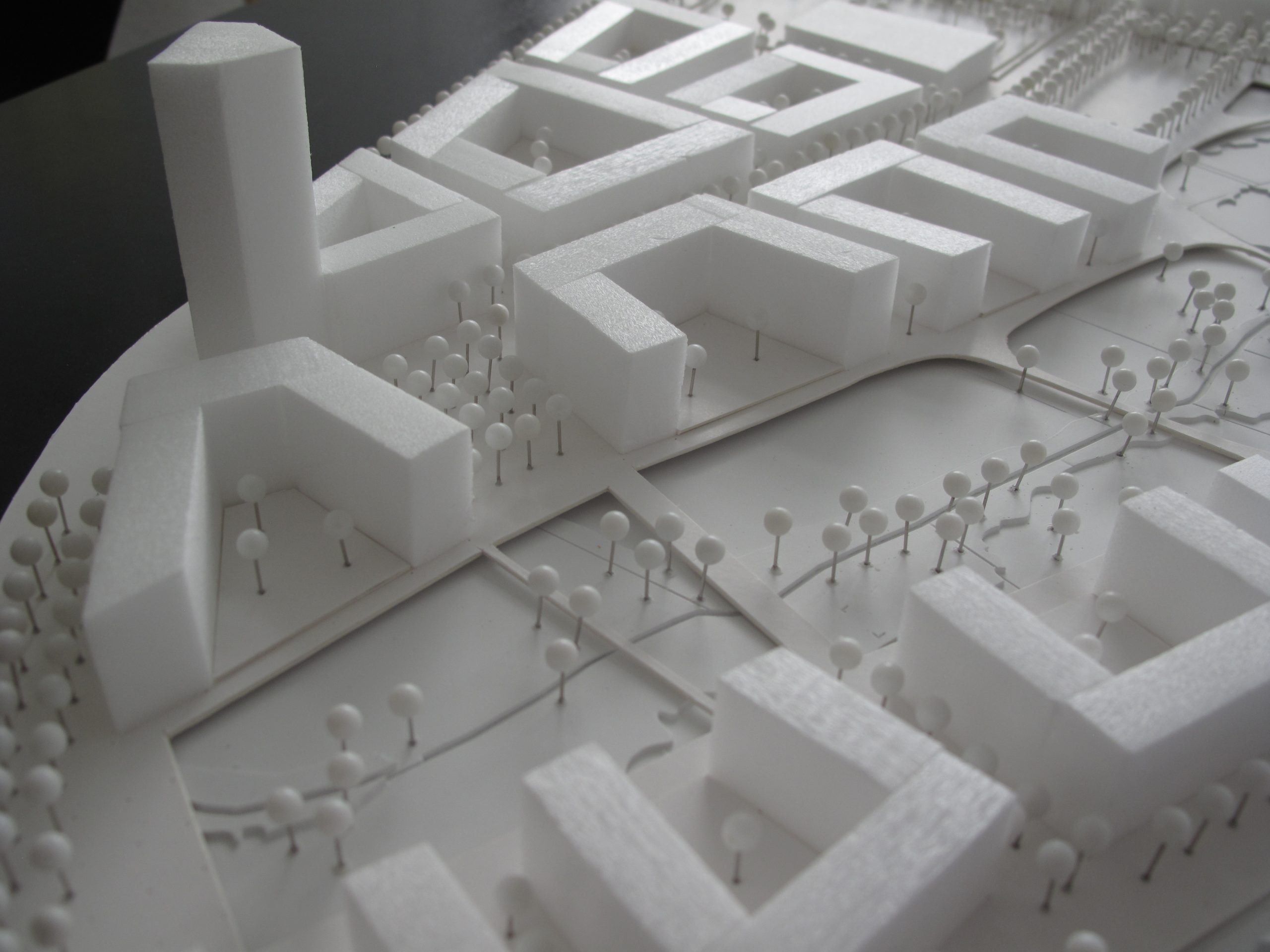 Besonderes Augenmerk liegt auf der Verknüpfung des neuen Quartiers, das von stark trennenden Verkehrsachsen umgeben ist, mit den angrenzenden Stadtquartieren. Das Bebauungskonzept reagiert mit einer entsprechenden Bebauung und Verteilung von Nutzungen auf die starke Lärmbelastung entlang der Verkehrsachsen.