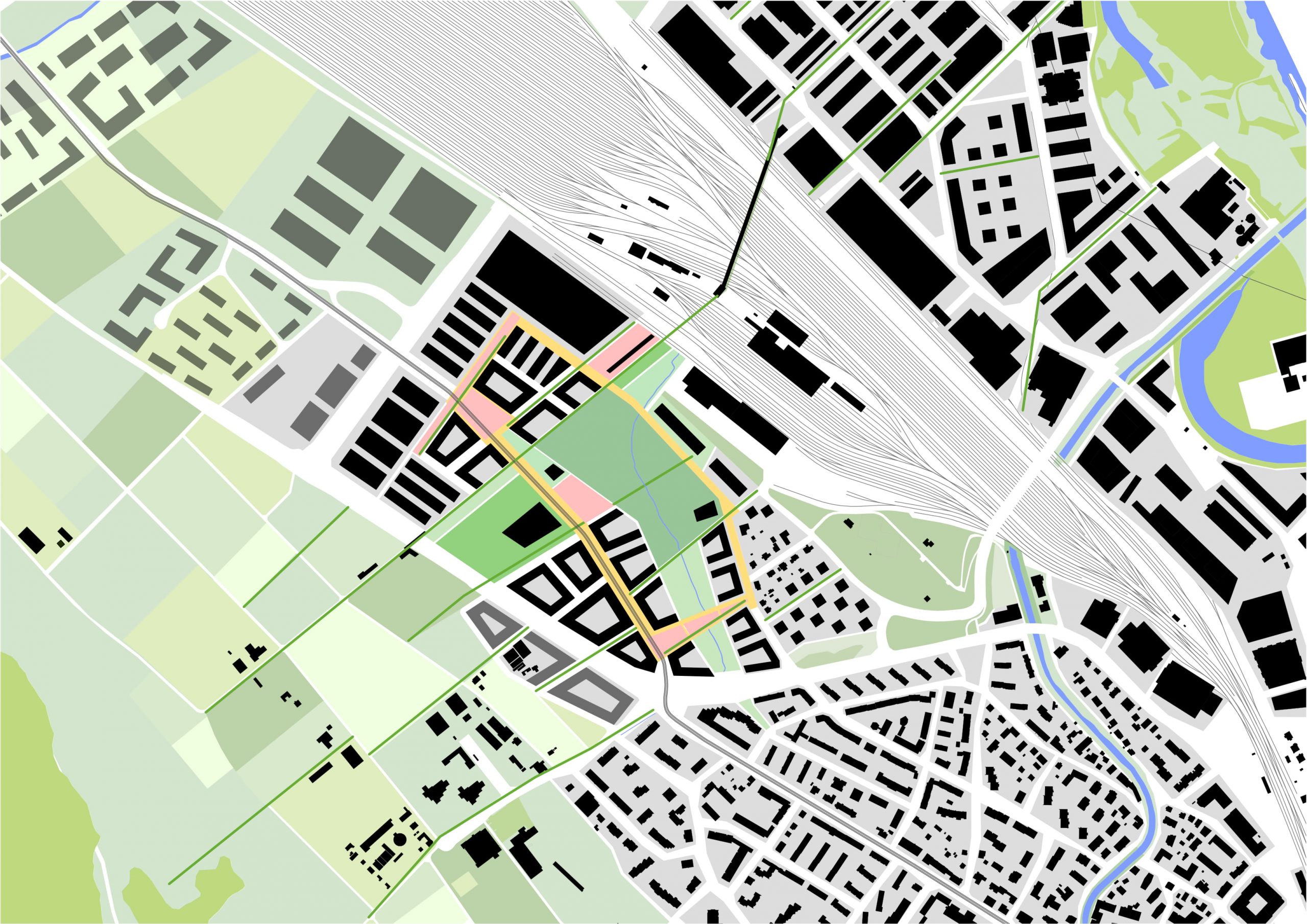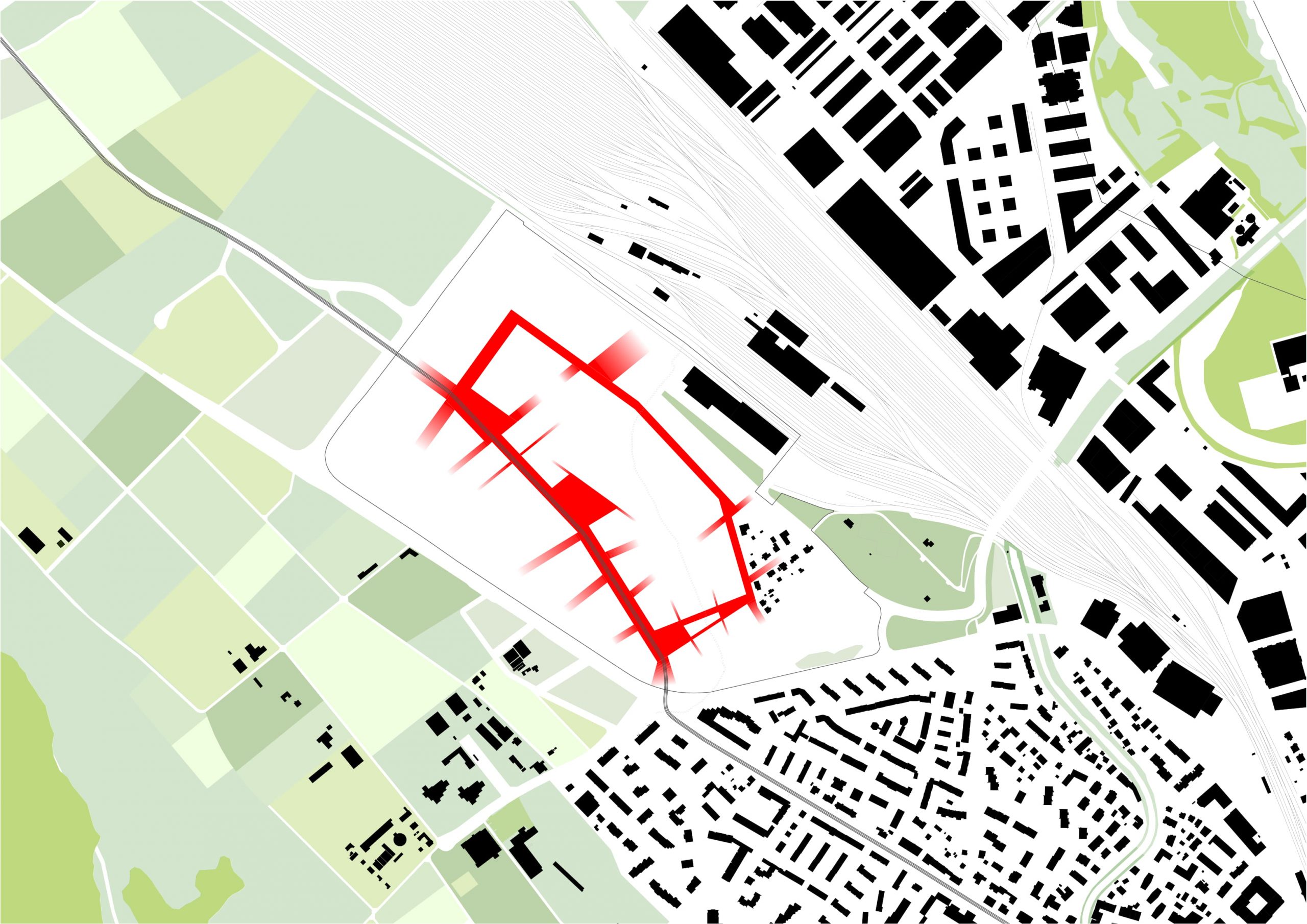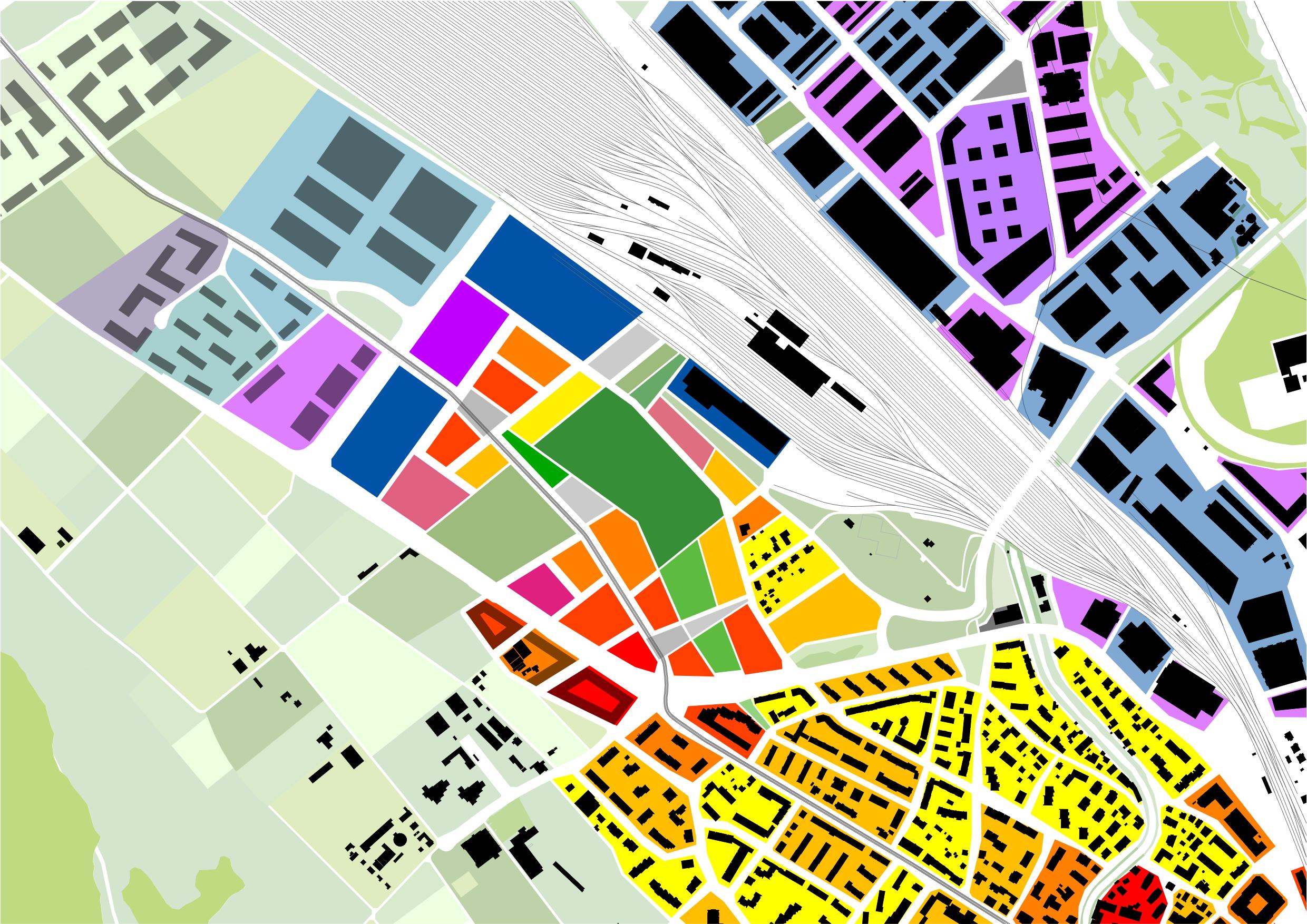 Besonderes Augenmerk liegt auf der Verknüpfung des neuen Quartiers, das von stark trennenden Verkehrsachsen umgeben ist, mit den angrenzenden Stadtquartieren. Das Bebauungskonzept reagiert mit einer entsprechenden Bebauung und Verteilung von Nutzungen auf die starke Lärmbelastung entlang der Verkehrsachsen.