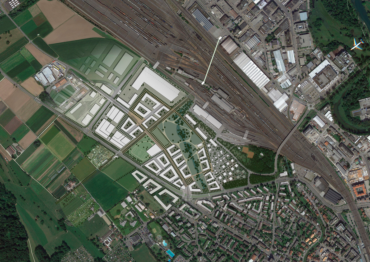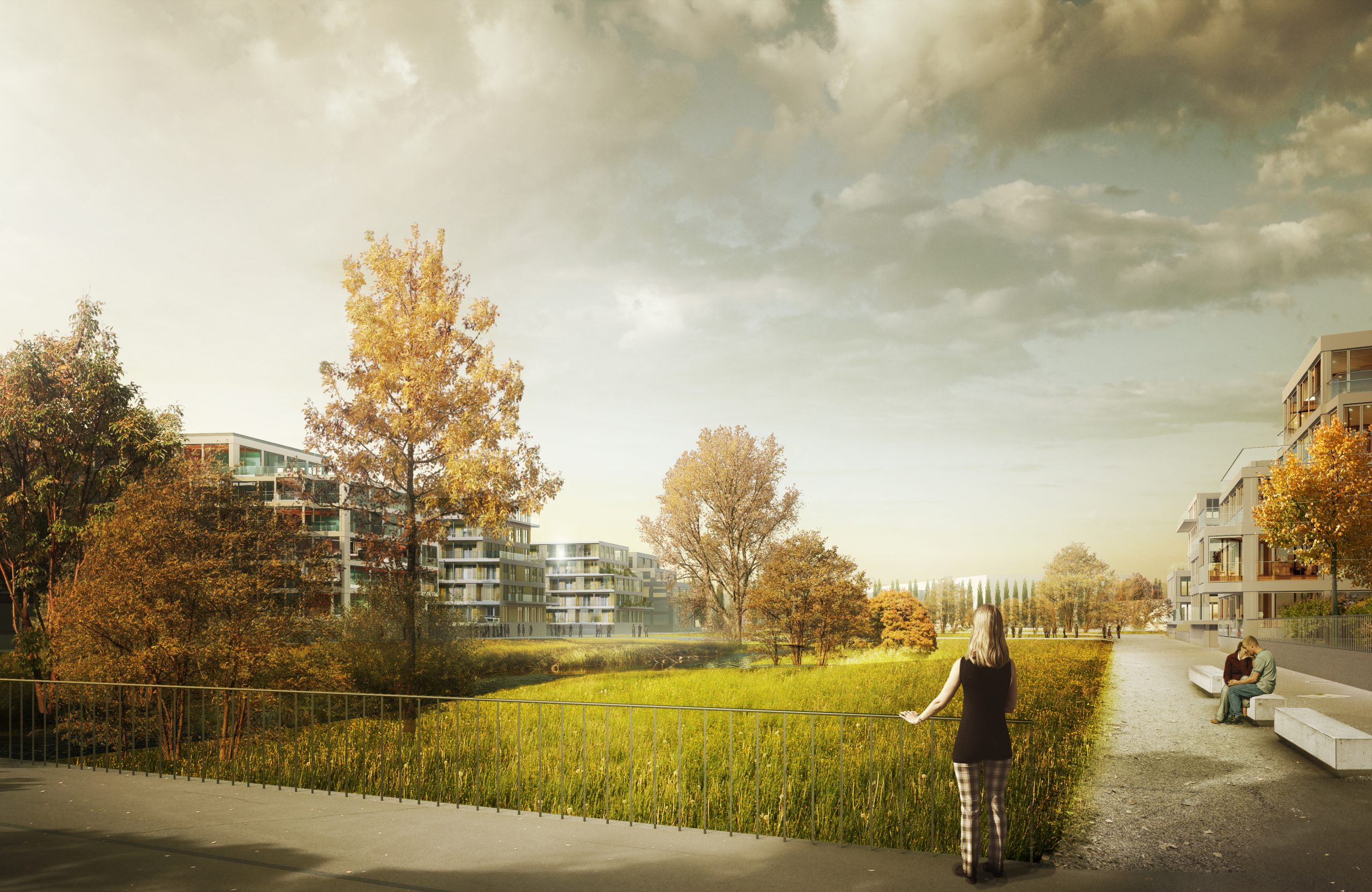 Das Konzept basiert auf der Anknüpfung des Areals an den Bestand, der Berücksichtigung von Sichtbezügen zu den umgebenden Hügelketten und der Aufnahme der bestehenden mosaikartigen Feldstruktur. Eine interne Ringerschliessung verbindet die drei Nachbarschaften, die sich um den zentralen Park mit Bachbett orientieren. Der hohe Nachhaltigkeitsstandard in allen Themenbereichen (Energie, Mobilität, Bauten, Freiraum) hat zum Ziel der Stadt Dietikon zum Nachhaltigkeitslabel “Energiestadt Label Gold” zu verhelfen.