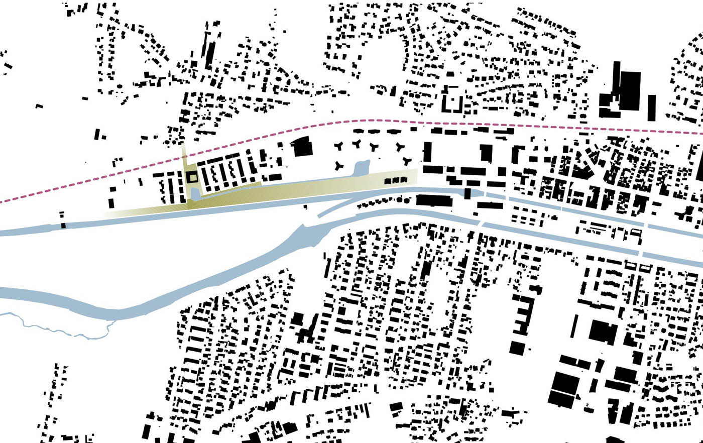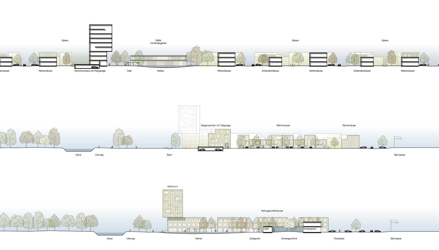 Zwischen Bahn und Kanal entsteht das letzte Glied in der Kette von den Spinnereibauten über den Spinnereipark und dem Gewerbegebiet zum Standort am Werkskanal. Auf dem keilförmigen Grundstück rückt die Bebauung nach Norden, hin zur Bahn, um im Süden den durchgehenden Grünstreifen entlang des Kanals fortführen zu können.Zwei „Cluster“ entstehen, im Osten parallel zur Bahn, im Westen zum Kanal hin ausgerichtet, verbunden durch eine gemeinsame Grünfläche mit eingelagertem Gebäude für zentrale Funktionen und der querenden Wegeverbindung von der Siedlung nördlich der Bahn zum Werkskanal. Zwischen Bebauung und Kanal entsteht ein Landschaftspark mit extensiv genutzten Flächen, die als Retentionsräume genutzt werden. Das Wohngebiet bietet eine Mischung unterschiedlicher Haustypen und Wohnformen, die der demographischen Entwicklung Rechnung tragen. Die Reihen- bzw. Stadthäuser bieten mit 2 oder 3 Geschossen mögliche Anpassungen an unterschiedliche Einkommensverhältnisse und Lebensphasen. Die Einfamilienhäuser sind auch als „Wachsende Häuser“ optional mehrgeschossig erweiterbar oder rückbaubar. Die Lärm abschirmende Bebauung im Norden ist nur durch die nach Süden abzweigenden Stichstraßen unterbrochen.