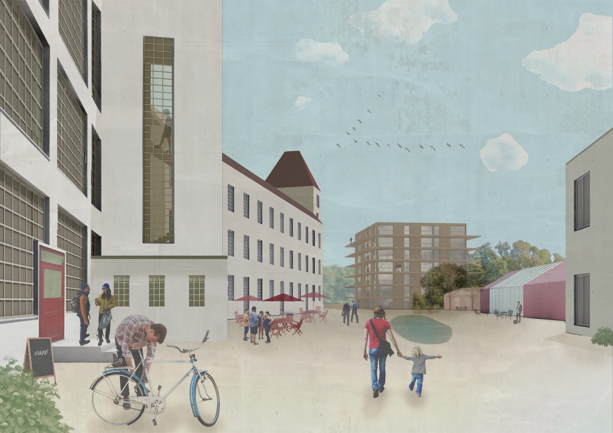 Im Osten des Areals wird die industrielle Identität durch eine aus Typenreihenhäusern der formulierten Siedlung und die Andeutung des ehemaligen Mühlkanals fortgeschrieben.