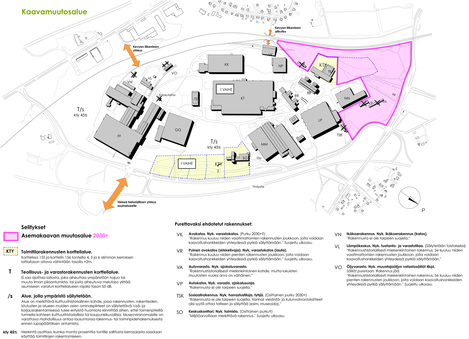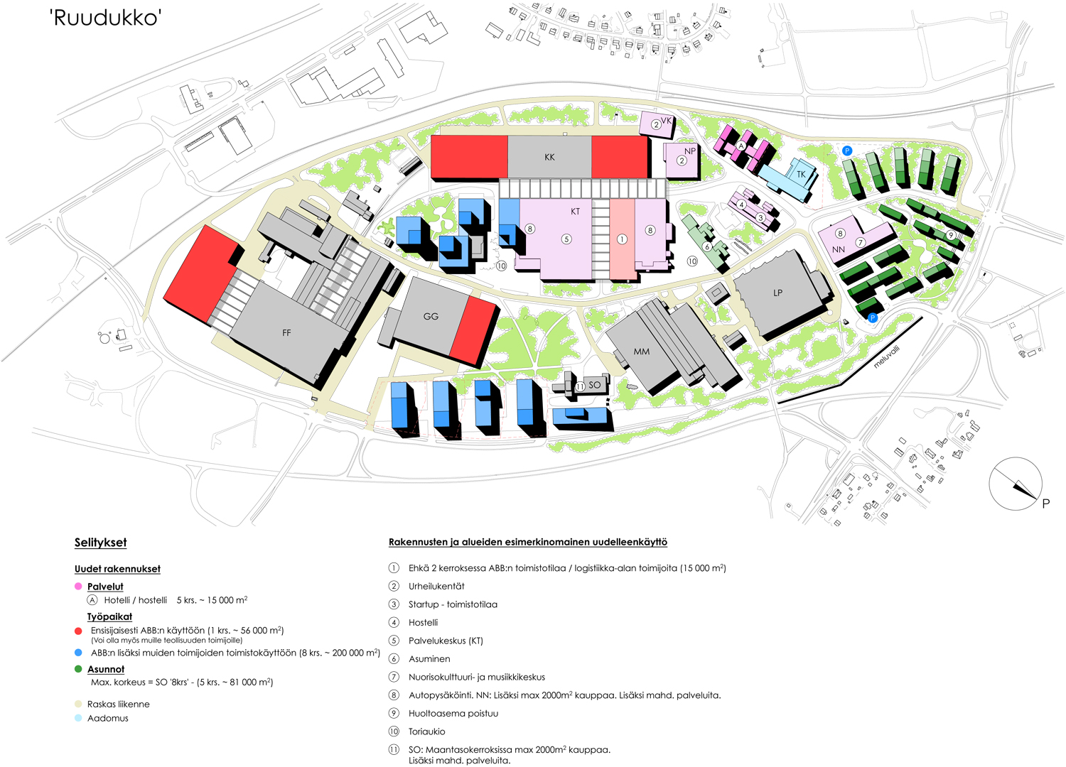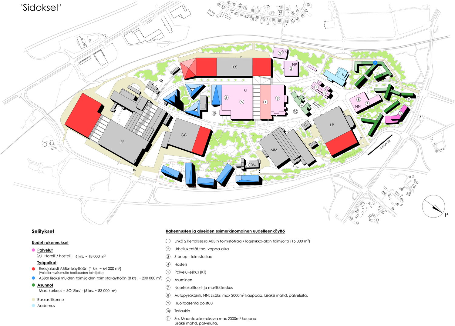 Strömberg Park is the largest business park in Finland. The engine of the area is ABB Finland Ltd, a manufacturer of electrical engineering solutions. The buildings of the area originate from the era of Strömberg Ltd and the first city plan of the area was made by Alvar Aalto in 1940’s. Aalto has also designed one of the functionalist buildings of the area with Egil Nicklin. Some of the industrial buildings are extremely large (even 100 x 300 m). The process with the client and numerous stakeholders was interactive, based on three workshops and in-between design development. The resulting plan supports the development of a mixed-use open campus. The plan takes into account historical preservation and the corporate demands. We outlined new office buildings and changes of use for the next stage of the development.
