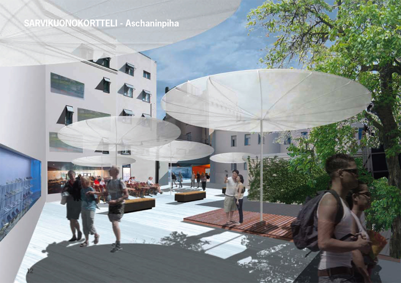 Es handelt sich um ein Revitalisierungsprojekt für das Rathausviertel im Zentrum von Helsinki. Die Stadt beschloss, Innenhöfe und Innenräume für neue Verwendungen zu öffnen. Der Entwurf basiert auf: Offenheit für alle Nutzergruppen, Erhaltung der historischen Identität, Verbindung von Restaurants, Büros und Kultur. Die Innenhöfe der vier Straßenblöcke werden der Öffentlichkeit zugänglich gemacht und miteinander verbunden. Sie werden mit neuen Oberflächenmaterialien und Außenmobiliar versehen. Neue Restaurants, ein Kindertheater, eine ‘Design und Kunst’-Straße, öffentliche Aufführungsorte u.v.a.m. sind vorgesehen. Als Ergebnis der Konzeptphase wird die Immobiliengesellschaft ‘Helsingin leijona’ gegründet, die die Veränderungen des Quartiers steuert.