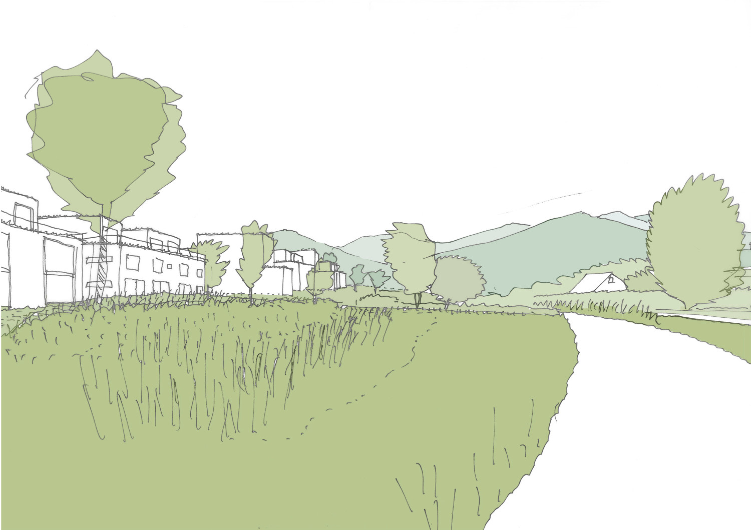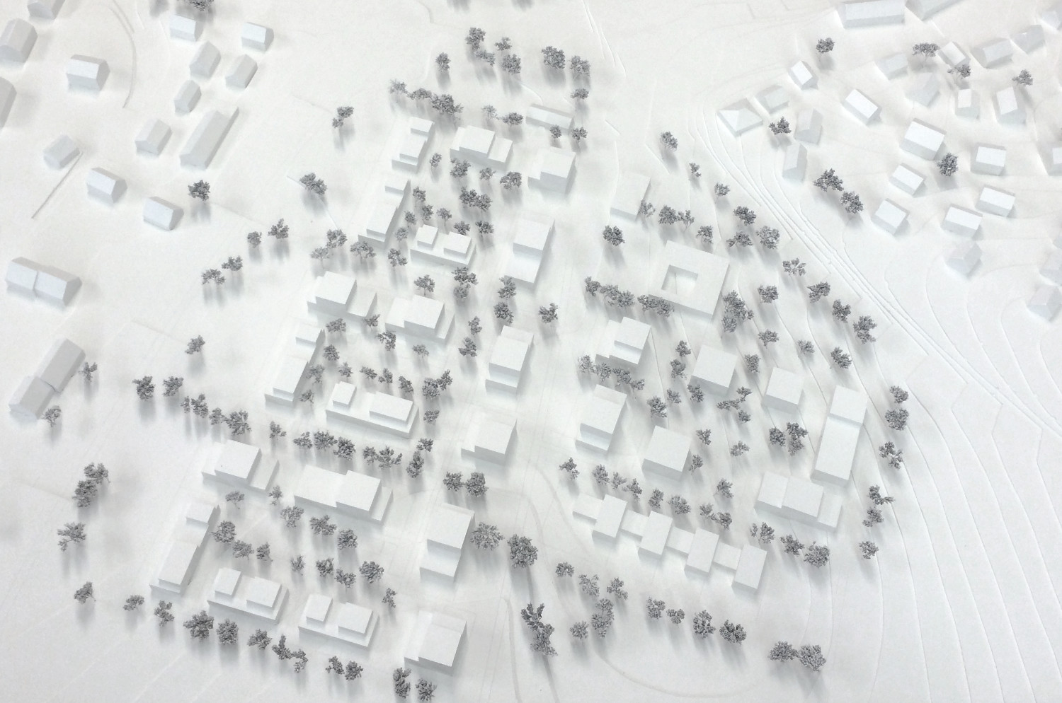 Städtebauliches Konzept – Am östlichen Ortsrand entsteht ein neuer Ortsteil, der am Übergang von Siedlung zu freier Landschaft zwischen Stadt und freier Landschaft vermittelt. Die Bebauung rückt im Süden von der Schwarzwaldstrasse ab und erhält so die weite Sicht in die Landschaft mit dem Schwarzwaldgebirge und dem Blauen im Hintergrund. Der Platz, der sich zwischen Bestandsgebäude, Cafe und Wohnhaus aufspannt, bildet den räumlichen Anknüpfungspunkt zum Ort und schafft eine Anbindung zum Fuss- und Radweg Richtung Stadtmitte, welcher sich westlich der Sulzburgerstrasse befindet. Entlang der zentralen Achse um den bestehenden Feldweg entsteht eine Raumabfolge von bebautem Raum zu offener Landschaft, die durch die bestehenden Obstbaumreihen gestaffelt wird: Platz, Kiga, Freiraum, Naturdenkmäler (Portalsituation), Naturspielplatz, offene Landschaft, Friedhof, Reblandschaft und Berge. Der zentrale Freiraum gliedert das Gebiet in zwei Cluster nördlich und südlich davon, die sich jeweils an der bestehenden Feldstruktur ausrichten und durch die bestehenden Obstbaumreihen gegliedert werden. Die differenzierte Höherentwicklung und das Abrücken der Bebauung tragen den Nachbarn Respekt, schaffen einen Vielfalt an Wohnangebote und Diversität. Die Anordnung der Wohngebäude um entspannte Gemeinschaftsgärten sorgt für sozialen Zusammenhalt.