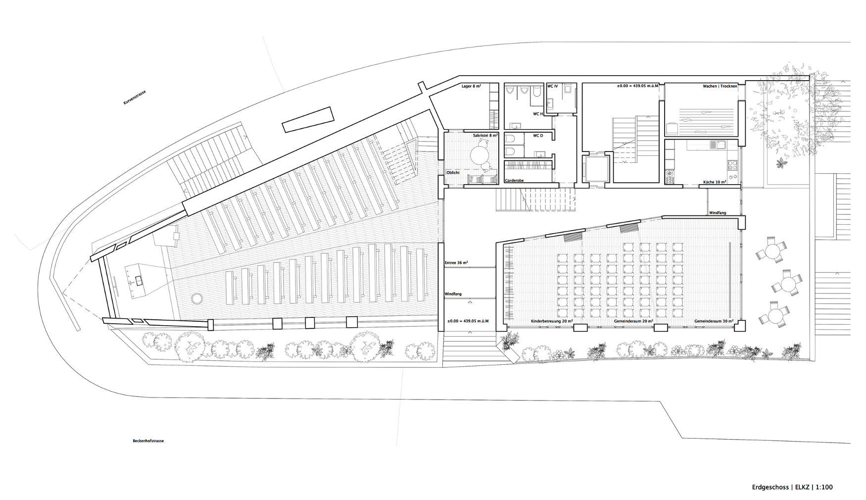 Neben der denkmalgeschützten Kirche entsteht ein Neubau mit Räumen für die Kirchgemeinde sowie Wohnungen. Das vorliegende Projekt entspringt dem Wunsch, die Teile des Ensembles in ein klareres Verhältnis zueinander zu setzen und dem expressiven Sakralbau deutlicher den Hauptauftritt zu überlassen, indem sich der Neubau etwas zurücknimmt. Der Neubau weist dementsprechend eine geometrisch einfache Kubatur auf und ist vom Kirchenschiff abgerückt. Zwischen den beiden Teilen des Ensembles entsteht dadurch – gewissermassen als gebaute Fuge – ein niedriger Zwischenbau mit einem neuen zentralen Eingangsfoyer. An der Kurvenstrasse springt er zurück und artikuliert damit den Nebenzugang zur Empore und zu einem neu geschaffenen Velounterstand. Das bestehende Eingangsportal erscheint nicht mehr als einseitig an die Kirche angelehnter Appendix, sondern fungiert neu als eigenständige Fassade des Zwischenbaus und wird durch ein hangwärts ansteigendes Dachvolumen bekrönt.