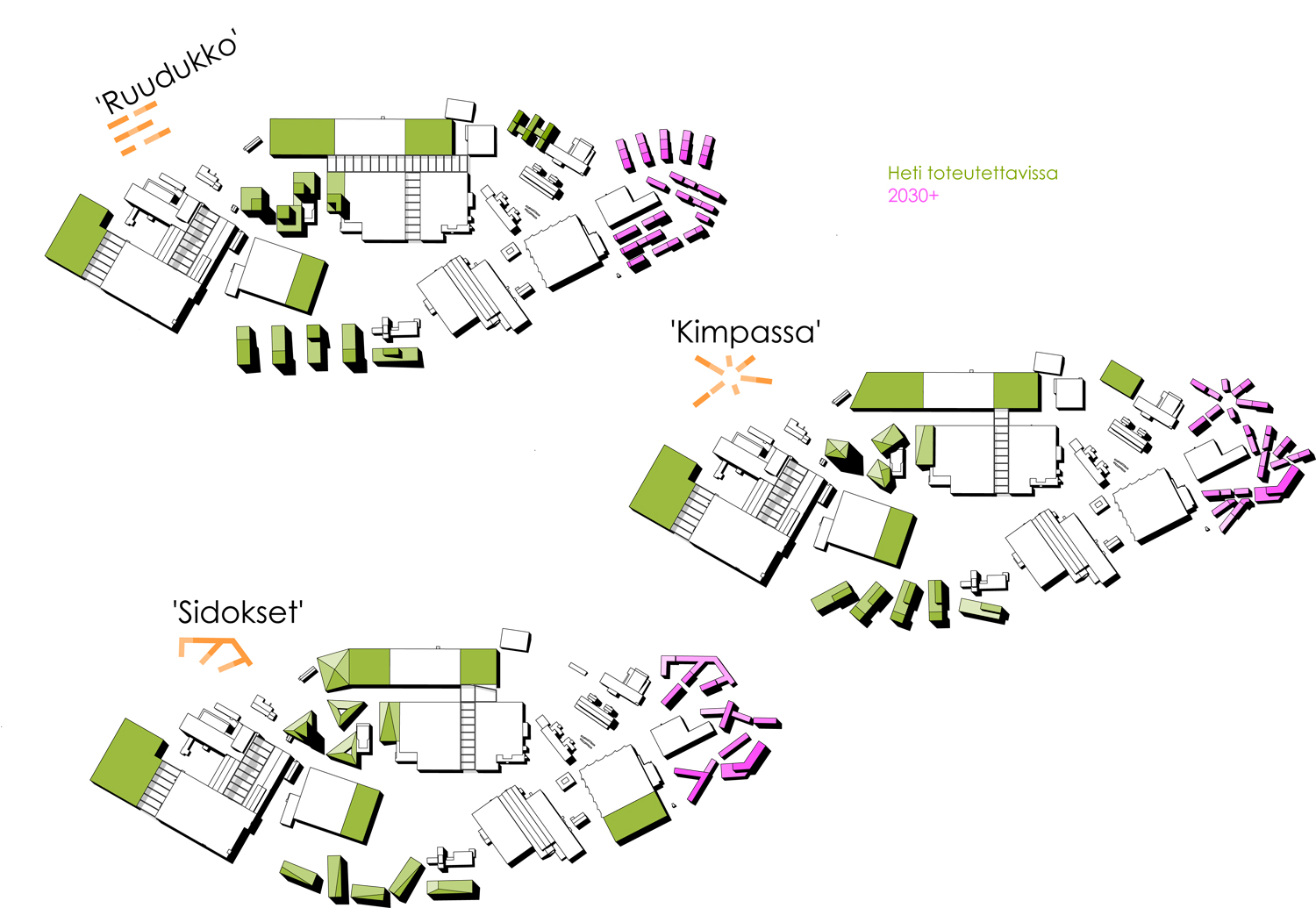 Strömberg Park is the largest business park in Finland. The engine of the area is ABB Finland Ltd, a manufacturer of electrical engineering solutions. The buildings of the area originate from the era of Strömberg Ltd and the first city plan of the area was made by Alvar Aalto in 1940’s. Aalto has also designed one of the functionalist buildings of the area with Egil Nicklin. Some of the industrial buildings are extremely large (even 100 x 300 m). The process with the client and numerous stakeholders was interactive, based on three workshops and in-between design development. The resulting plan supports the development of a mixed-use open campus. The plan takes into account historical preservation and the corporate demands. We outlined new office buildings and changes of use for the next stage of the development.
