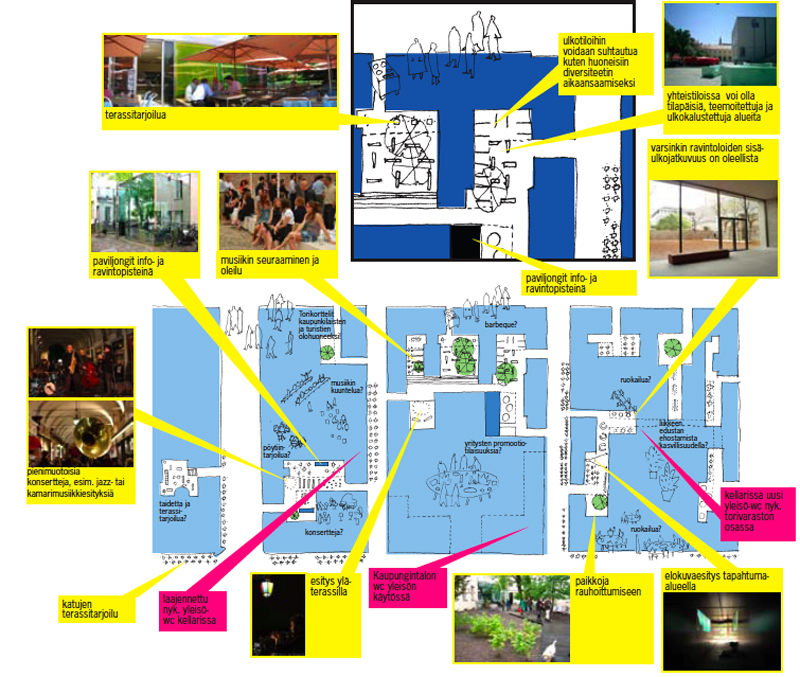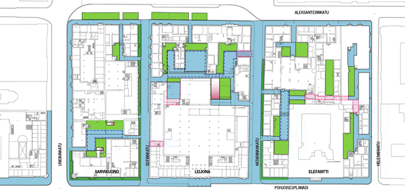 This is a revitalization project for the City Hall quarters in the heart of Helsinki, between Senate Square and Market Square. The city has decided to open up courtyards and indoor spaces for new activities. The principles of the development are: openness to all user groups, preserving historical identity, and combining restaurants, work places and culture. The courtyards of the four blocks become accessible for the public and are connected. They receive new surface materials and outdoor furniture. Numerous new restaurants are projected, as well as a childrens’ centre, a ‘design and art’ street, outdoor performance spaces etc. One result of the concept stage is the establishment of ‘Helsingin leijona’, the real estate company which orchestrates the change.