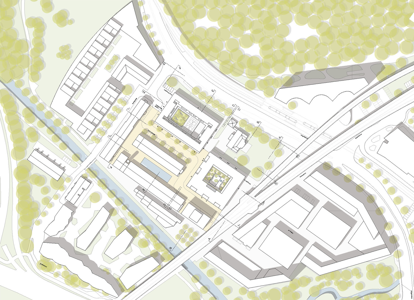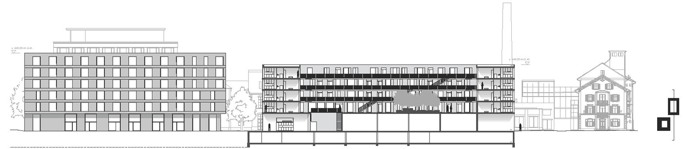 The old yarn factory area – Zwicky Areal – in the growing Zurich region is transforming itself into a mixed-use quartier. The area is surrounded and cut into pieces by transportation infrastructure. The last building phase A6-A9 in the heart of the area is intended to bring the mosaic-kind of whole together. The task was to insert student and elderly housing and retail facilities into the core of Zwicky Areal. In a context with severe exposure to noise, we created two compact urban blocks with peaceful courtyards – one for students, one for seniors. The industrial context is reflected in the architectural expression of the building.