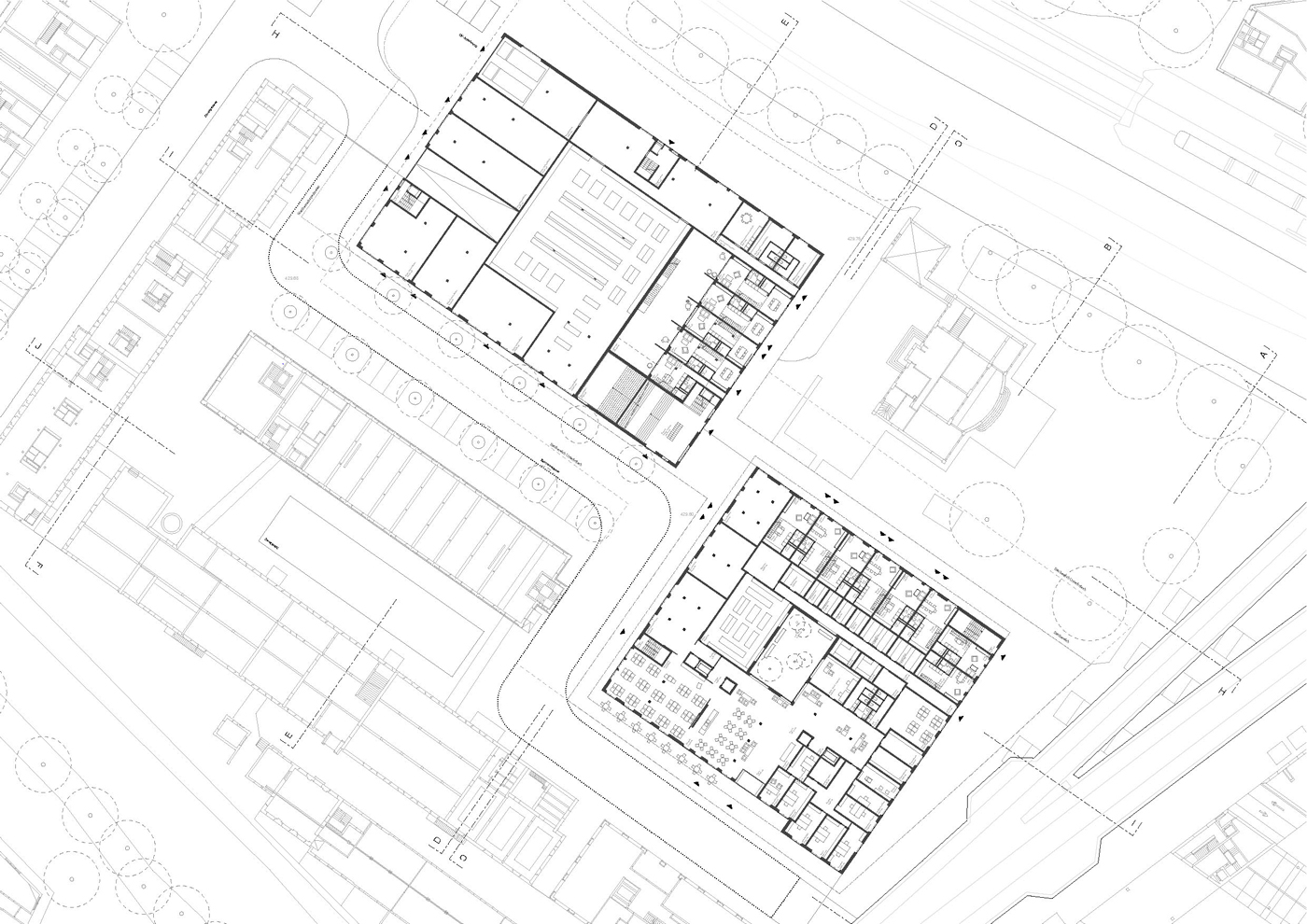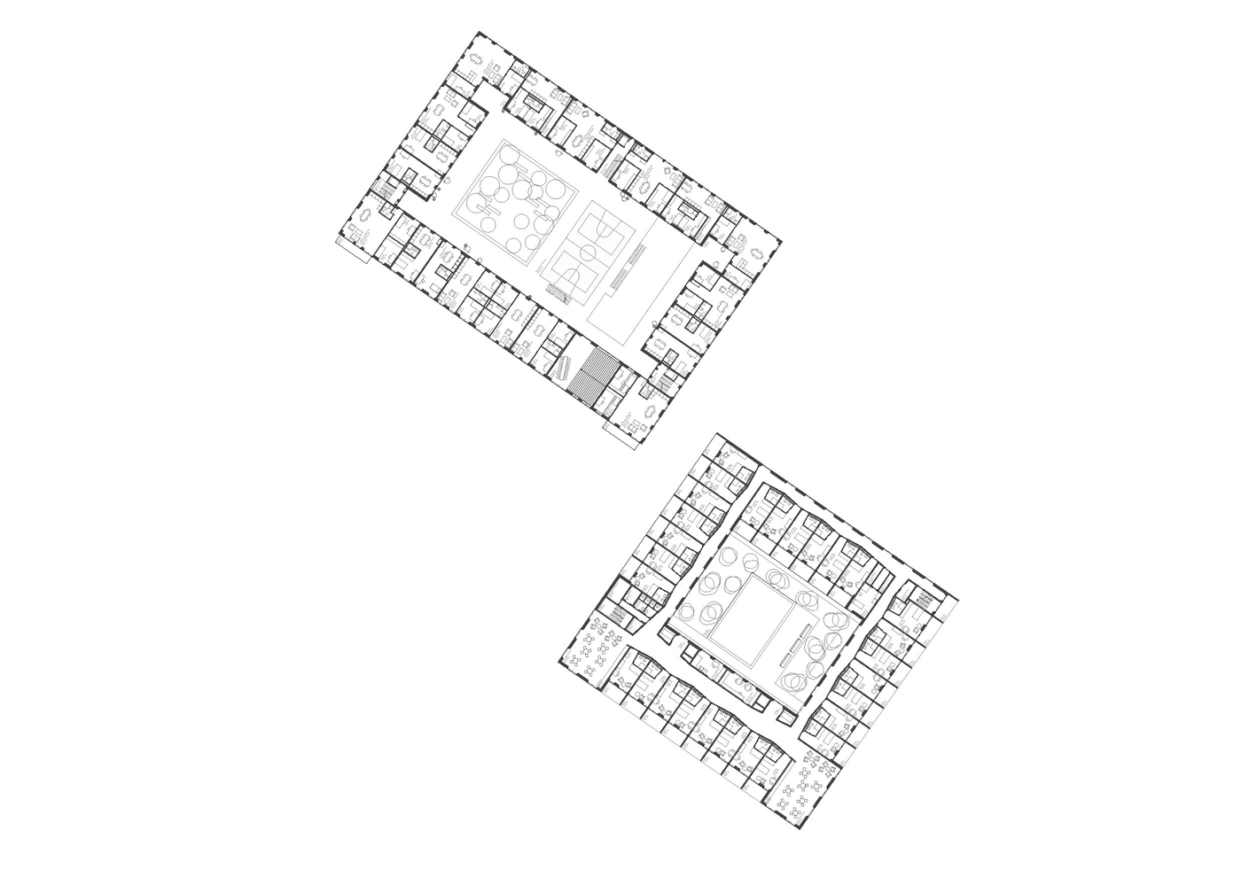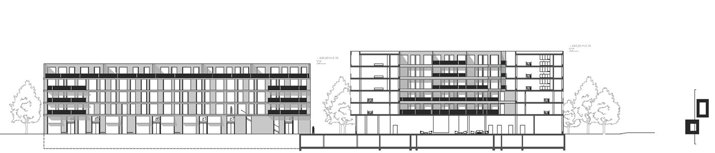 Elderly Housing: The residents of senior housing benefit from the spacious common areas on the ground floor, opening towards the main public spaces of the area. The serviced elderly home take the next two floors benefiting from the courtyard. The apartments for independent living are located in the upper floors. Ring-like corridors ease orientation, offer meeting places for the residents and allow changing views into the courtyard and surroundings.